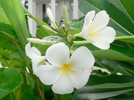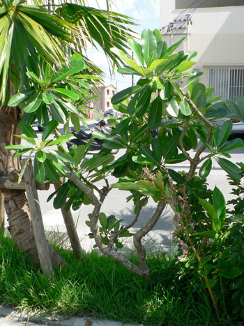 那覇新都心、銘苅の住宅街にあるパリのパン屋さんへ行ってみようと車を走らせていると、南国リゾート風のオサレ~な建売分譲住宅の一角で、見つけましたよ、プルメリアのシンガポールホワイト(オブツサ)です。