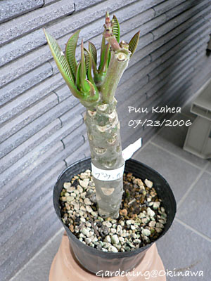 さて、しばらく更新していませんでしたが、その間にもいくつか購入した苗があるのでまずはオオシロ樹木さんで購入したプルメリア”Puu Kahea”です。