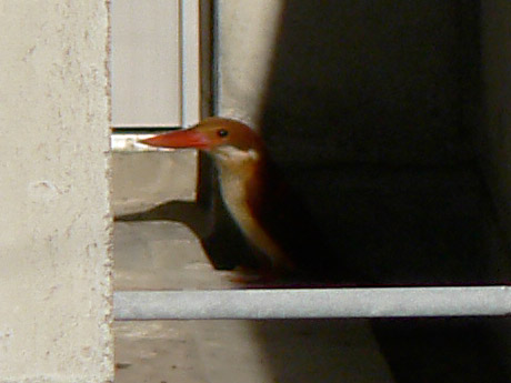 って話したのですが、奥さんがベランダの窓を開けた瞬間、アカショウビン (らしき鳥さん)は家と家の間を抜けて飛んで行ってしまいました・・・。